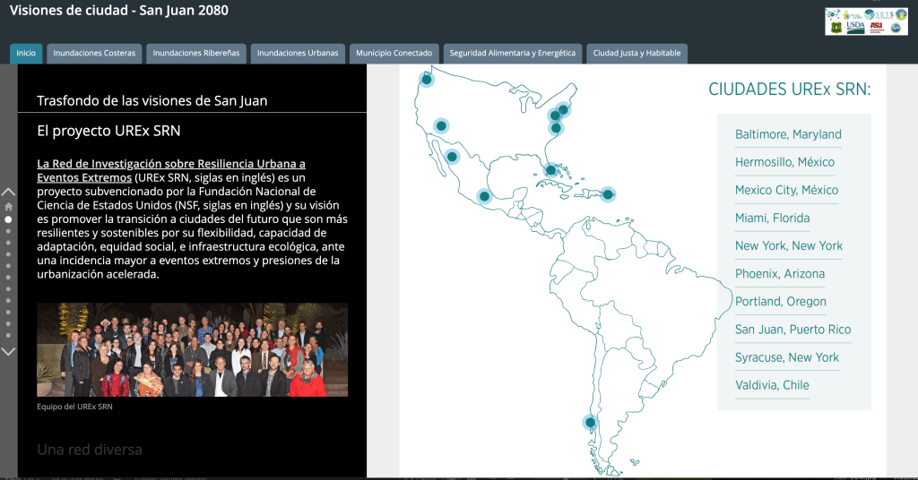 My principal objective was to build an interactive toolkit that visually presents data and results from the UREx SRN and San Juan ULTRA projects in an accessible and interactive platform using ArcGIS Story Maps for public audiences in San Juan, Puerto Rico. The online transitions toolkit is designed to assist communities and decision-makers in San Juan, Puerto Rico to learn from and be inspired by participatory visions of the future in 2080 to transition to a more resilient, connected, food & energy secure, just, and livable San Juan. In other words, to turn this valuable knowledge into action and on-the-ground projects. Above are screenshots of the Story Map we developed to allow communities and decision-makers to interact with the knowledge products from multiple sources including the work of the UREx SRN, the San Juan ULTRA, and others. The Story Map is a synthesis of many information sources and types including key challenges the region faces, participatory visions of the future, image renderings of those visions, stories or narratives of the future, key strategies that participants would like to use to achieve that future, strategies that other cities are using, and other resources.
